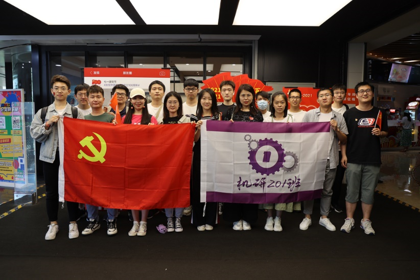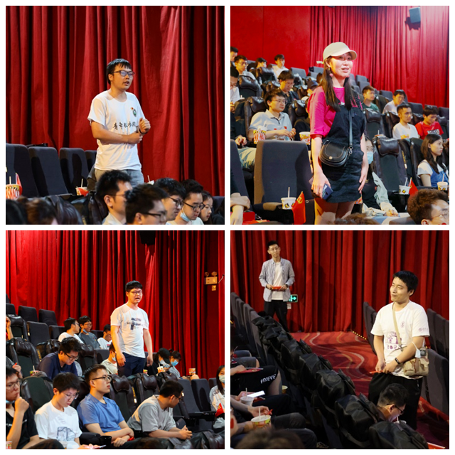 观影候场时,海角社区 2020级光工学硕2班党支部、清华大学机研201、171党支部的同志们手持党旗,在制作的建党100周年主题的立牌处进行拍照打卡留恋,以表达对党的祝福和对未来的希冀。在这样轻松和欢快的氛围中,各支部同志相互进行了密切且深入的交流,活动热情达到了高点。