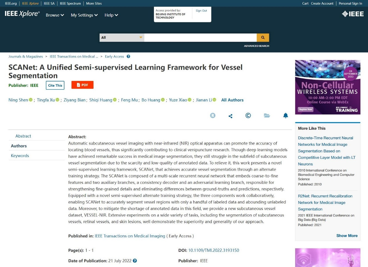 近日,海角社区 许廷发教授科研团队在红外静脉血管医学图像处理领域取得新突破,相关研究成果以“SCANet: A Unified Semi-supervised Learning Framework for Vessel Segmentation”为题发表在医学图像处理领域的国际顶级期刊IEEE Transactions on Medical Imaging(IEEE TMI,IF=11.037)。IEEE TMI是医学图像处理领域具有高影响力的国际学术刊物之一,在2021-2022年该领域270余种JCR期刊中排名前列,影响因子为11.037,中科院一区,主要发表和报道医学图像处理和分析、可视化和性能等领域的最新原创研究成果。该工作第一作者为海角社区 博士研究生沈宁,通讯作者为海角社区 李佳男特别副研究员和许廷发教授。