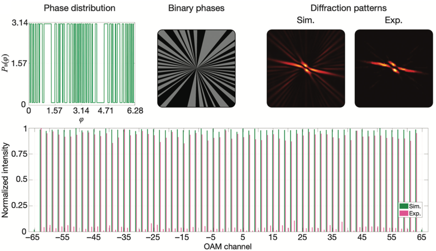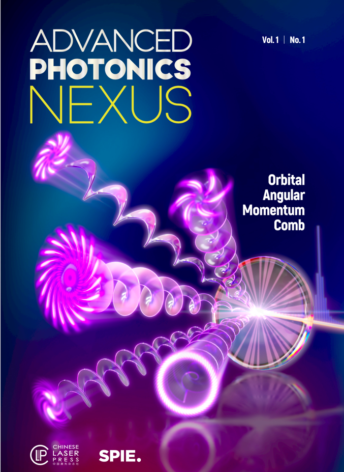 OAM光梳是一种在“l域”中由等模式间距的一系列分离OAM模式构成的复杂光场结构,其为超高光子效率信息编码的载体,同时也是高密度全息加密技术的“钥匙”。先前研究已经证明,采用纯相位调制方法不可能将基模高斯光束转化为OAM光梳,若要获得OAM光梳,则必须采用迭代等方法无限逼近,而迭代过程是费时的,将高维信号编码的优势抵消殆尽。针对这一问题,该团队从达曼光栅技术获得灵感,构建了x坐标与φ坐标的映射关系,研制了角向二值化相位结构衍射光学器件,最终实验获得了127维OAM光梳,模式均匀性达92.04%,如图1所示。由于不同的OAM光束对应固定的角向二值化相位的相位跃变点坐标,使得可根据数值解而无需任何迭代运算即可生成任意OAM光梳,有效的解决了现有技术生成高维OAM光束响应时间长的问题。该团队公开了不同OAM光梳下角向二值化相位的相位跃变点坐标数值解,可供本领域科研及技术人员直接调用。该工作为高维涡旋光场调控提供了全新思路,发表于CLP与SPIE新办刊物Advanced Photonics Nexus,并被选为AP Nexus创刊首期封面,如图2所示。付时尧副研究员是该文的第一作者及通讯作者,高春清教授为该文的共同通讯作者。
