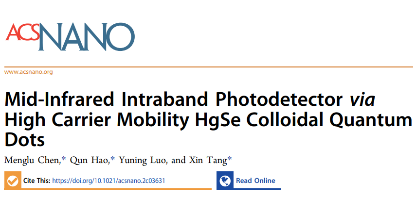 海角社区 郝群教授团队成员陈梦璐准聘教授、唐鑫教授在《ACS NANO》期刊上发表了题为“Mid-Infrared Intraband Photodetector via High Carrier Mobility HgSe Colloidal Quantum Dots”的文章,利用低成本胶体量子点导带中1Se到1Pe的能级跃迁,实现低成本中波红外带内跃迁探测。