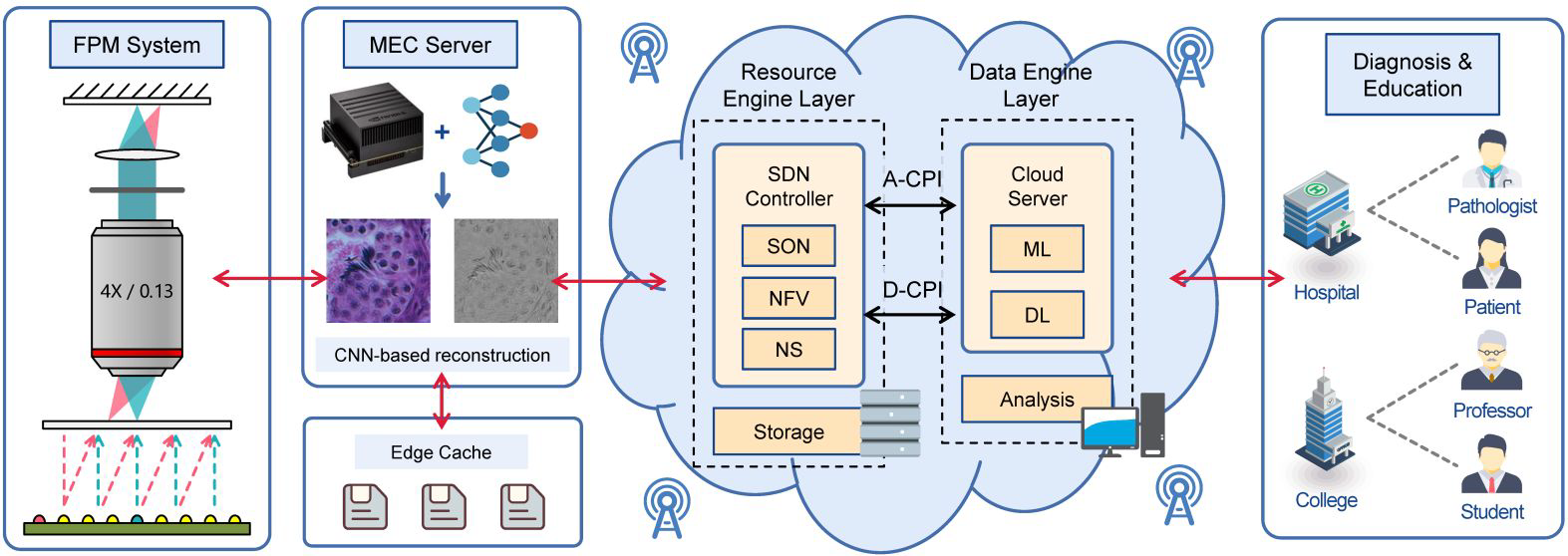 该系统利用编程式照明模块的主动照明取代了机械扫描,结合生成对抗神经网络实现多模态、高分辨率病理图像的重建,降低了成本,提高了成像速度;实现了边缘计算节点和网络通讯节点的有机结合,提高了数据传输和通讯效率。该研究首次将傅里叶叠层显微计算成像与边缘计算相结合,为远程病理成像和诊疗提供了新思路。