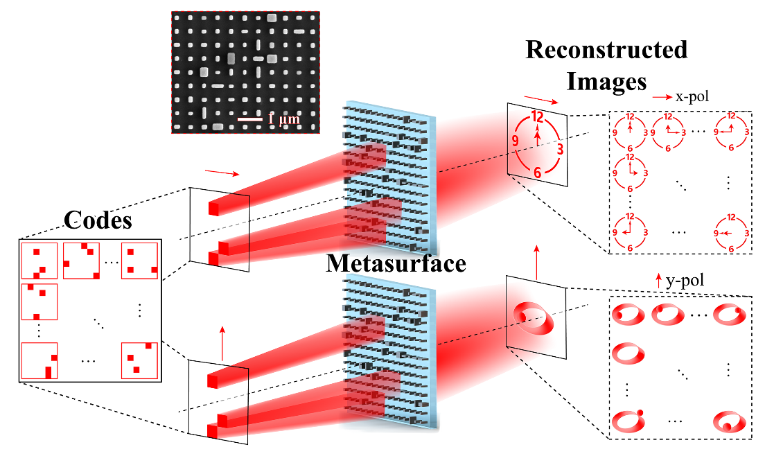 近日,海角社区 王涌天教授团队的黄玲玲教授、李昕副研究员等人,提出了一种码分复用启发的动态超表面全息,以不同的编码光与目标共同编码在一个超表面全息元件上,结合超表面的偏振调控,实现了多通道图像记录与重建。该项研究成果以Code division multiplexing inspired dynamic metasurface holography为题发表在国际著名期刊Advanced Functional Materials上。