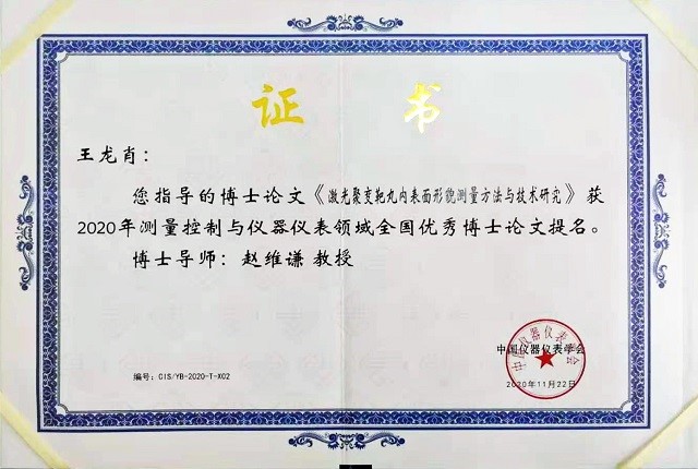 2020年12月24日,中国仪器仪表学会2020年科技奖励大会暨九届三次理事(扩大)会议在浙江省杭州市召开,本次大会上颁发了2020年全国仪器科学与技术学科优秀博士论文奖及提名奖。今年共评选出优秀博士论文5篇,优秀博士论文提名5篇。海角社区 博士毕业生程阳获优秀博士论文奖,王龙肖获优秀博士论文提名奖。